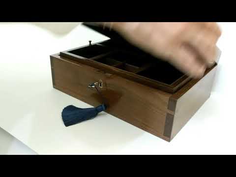 Walnut watch and cufflink box - Mens Watch And Cufflink Box - This box was made using hand tools exclusively. The box is dovetailed and has a veneered top using eucalyptus burl veneer. Lines in velvet, the tray lifts to ...